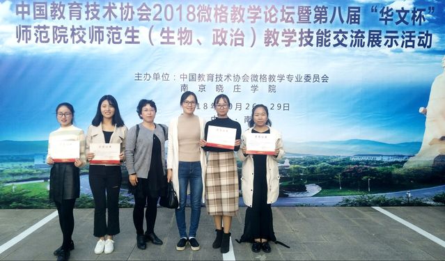 本报讯(通讯员戴月) 2018年10月26-28日,由中国教育技术协会微格教学专业委员会主办、江苏南京晓庄学院承办的第八届“华文杯”全国师范院校师范生教学技能大赛在南京晓庄学院举行。我校化学与生命科学学院选派2015级生物科学专业的郭冰雪、刘婉、杨爽、曾祥玮等四位同学,在戴月、齐小琼和朱世明等老师带领下参赛并取得优异成绩。