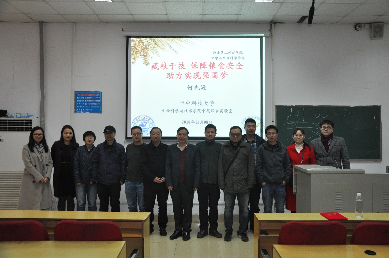 11月8日,华中科技大学理学院副院长、生命科学与技术学院博士生导师何光源教授应邀来我院作题为“藏粮于技保障粮食安全助力实现强国梦”的学术报告。化生学院全体老师及100余名学生聆听了报告。报告会由化生学院曾国平院长主持。