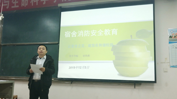 本网讯(通讯员何玉茹)2019年12月5日下午六点半,化学与生命科学学院于实验楼s6202举办宿舍消防安全培训会。18级19级寝室长参加本次会议。本次培训会由化生院学工办主任宦忠虎主讲。