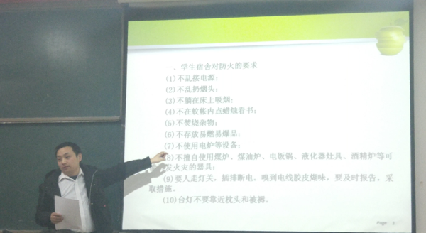 在本次培训会中,宦忠虎就消防安全意义进行了简单的讲解,然后引导大家观看了数个关于消防和安全用电的实例视频。随后,宦忠虎仔细地讲述了宿舍防火要求,如何排除安全隐患以及消防安全需要熟记的常识,特别强调了宿舍安全用电要求,宿舍要做到人走断电,不违规使用电器。同时,还要求寝室长要担起自己的职责,积极搞好宿舍的日常管理,关心宿舍每一个的同学,指导和督促同学们做好寝室安全工作节。此外,宦忠虎结合自己的亲身经验向同学们讲述了在火灾中爆炸的威力,让同学们对火灾有了更加真实具体的印象。