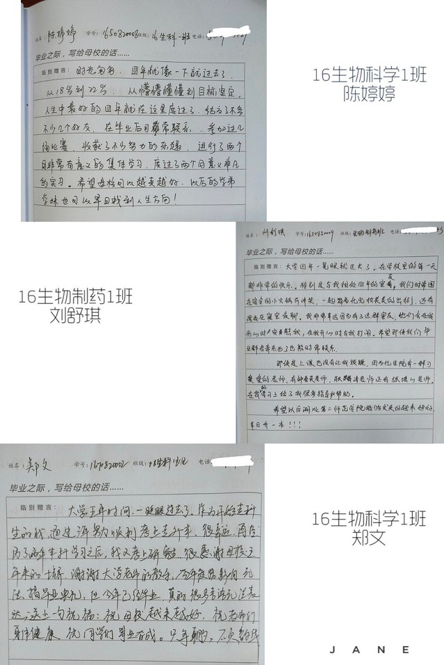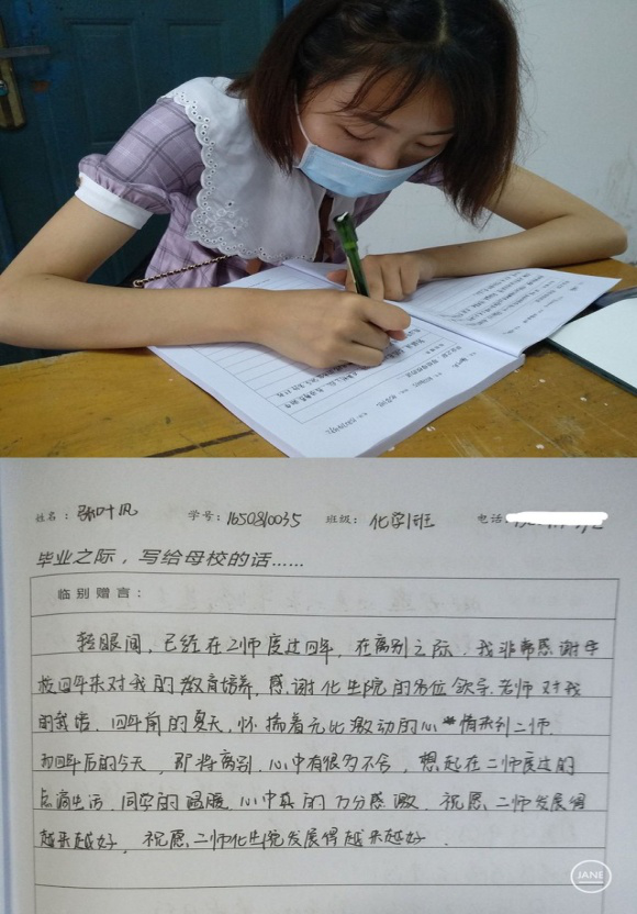 同学们在留言本上写满了对母校的祝福,因为疫情的关系,大家觉得很遗憾,没有拍毕业照和毕业的典礼,但是大家都对母校的未来发展充满信心,很感谢学校和老师对他们的培养和帮助,刘舒琪同学说:“在学校里的每一天都非常的快乐……,我非常幸运有这样一群室友,他们在我伤心时安慰我,在我开心时与我一起打闹” 。“即使上课也没有让我烦躁,因为有一群可爱的老师,有钟春英、肖长青还有张耀心老师在我的学习上给了我很多指导和帮助。”16级化学1班的张叶风同学在毕业留言薄上认真写下自己的心里话:感谢化生学院领导老师对我成长倾注的时间和精力,就要毕业,不舍二师的点滴,同学的温暖,祝愿学院越来越好,二师越来越好……