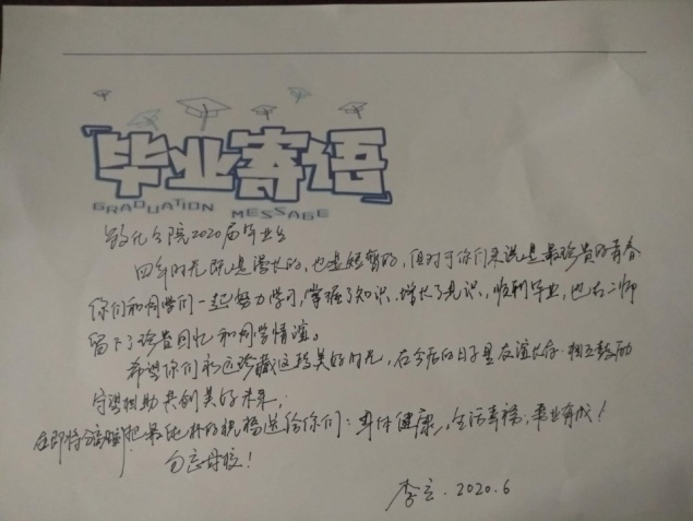 化生院有着我们共同的记忆,对于毕业的同学,老师们有一个共同的心愿:希望同学们不负韶华、努力向上,勇敢的去实现自己的梦想。以下是部分老师对毕业生们的祝福: