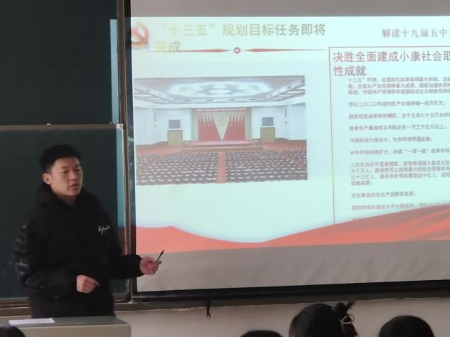 本网讯(通讯员赵雅静)2020年12月16日中午12:15,化学与生命科学学院化学2020级2班团支部组织全班51名同学在s6202展开了以“深入学习宣传贯彻党的十九届五中全会精神”为主题的团日主题班会。目的是扎实推进班级团支部组织力的提升,同时,丰富支部成员的团组织生活,增强支部成员的团体感和荣誉感, 提高同学们的思想觉悟,深入学习宣传贯彻党的十九届五中全会精神,展现我班团支部特色的团组织建设以及我班共青团员的活力和风采。