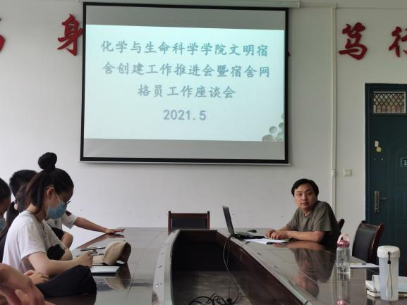 本网讯(通讯员 薛骏)2021年5月14日中午12:30,化学与生命科学学院在学院会议室召开了宿舍网格员座谈会,安排部署宿舍文明创建工作。会议由学工办主任宦忠虎主持。