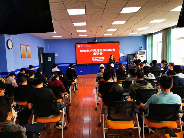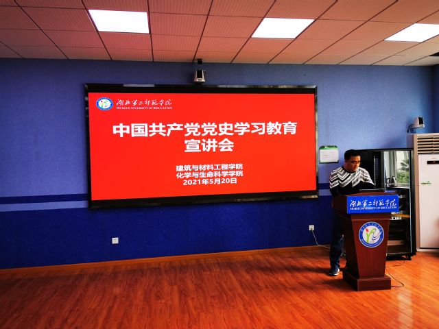 本网讯(通讯员 余嗣丽)按照学校党史学习教育总体部署,2021年5月20日中午1点,化学与生命科学学院、建筑与材料工程学院在S5209教室联合举办了中国共产党党史学习教育宣讲报告会,学校宣讲团成员马克思主义学院青年教师杨永华为全体党员教职工讲授专题党课。会议由化生学院分党委书记严莉萍主持,两个学院全体党员教职工聆听了这场生动感人、催人奋进的党史宣讲报告。