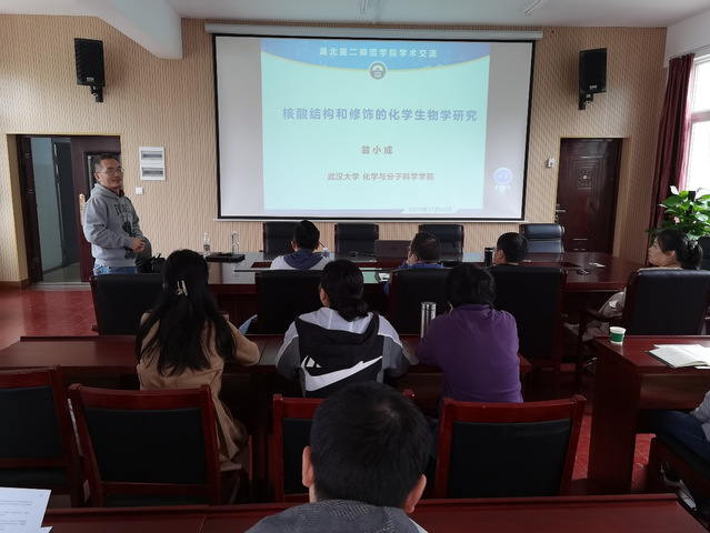 2021年11月5日上午,武汉大学化学与分子科学学院翁小成教授受邀访问我院并进行学术交流。在化生学院会议室翁教授作了一场题为“核酸的修饰和检测在化学生物学中应用”的学术报告。本次报告会由化生学院曾院长主持,学院师生20余人聆听了报告。