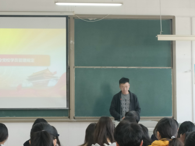 本网讯(通讯员 陈黔 )为使学员坚定入党信念,明确入党动机,进一步深入学习党的理论知识,2021年11月15日12时30分湖北第二师范学院第29期化学与生命科学学院(以下简称“本院”)第5期发展对象开班典礼在s6201教室顺利召开。本次典礼由本院学生党员姚宇杰主持,参会领导为本院党委书记兼分党校校长严莉萍、组织员李立、学生党支部书记高丽娥、分团委副书记邱梦莹和张灏,参会人员为本院41名发展对象。