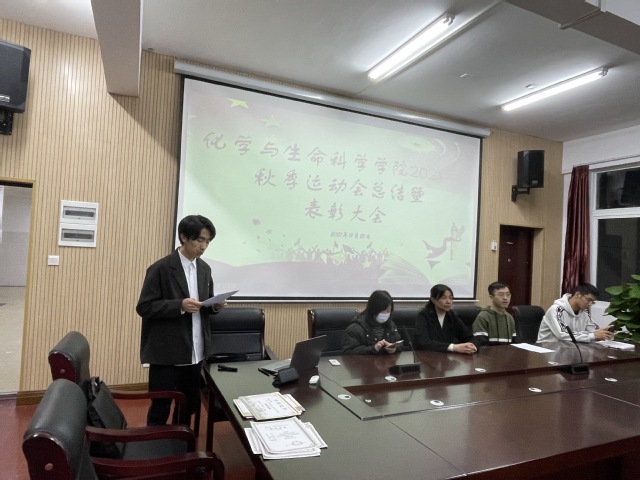本网讯(通讯员 邓子怡)为表彰先进集体与个人,弘扬更高、更快、更强的体育竞技精神以及认真总结此次运动会工作。2021年11月21日晚6时30分,在分团委学生副书记姚宇杰的主持下,化学与生命科学学院(以下简称“本院”)2021年秋季运动会总结暨表彰大会于本院会议室顺利召开。参会领导为分党委副书记雷晓林,分团委副书记邱梦莹、张灏。参会人员为分团委主席团代表李超,各部门代表以及运动会表彰对象。