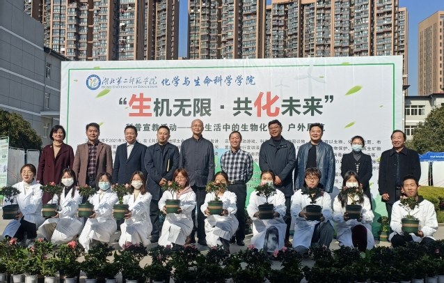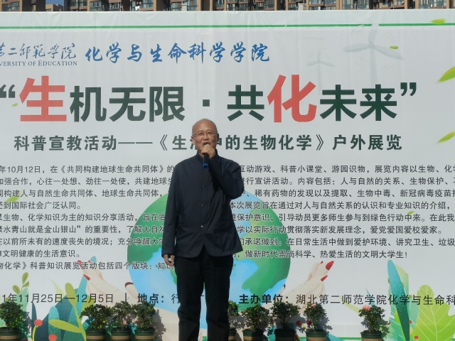 本网讯(通讯员 蒋怡菲)  2021年11月25日13时,“生机无限,共化未来”科普宣教活动之“生活中的生物化学”户外展览于行知广场正式拉开帷幕。校党委常委、副校长黄颂,学校办公室主任王青、宣传部部长方喻、学工部部长金殿中、校团委书记文敏、招生就业处处长刘儒国、资产管理处处长钟建国、综合治理与保卫处处长吴健、后勤集团党总支书记吴晓健、校办副主任谢莎莅临活动现场揭幕,本院党委书记严莉萍、院长曾国平、党委副书记雷晓林及“师友·学友行动”联系单位人员出席,校学生会代表、本院师生参加。