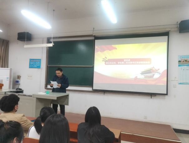 本网讯(通讯员王能清)2022年4月20日,化学与生命科学学院第6期预备党员暨发展对象党校培训班开班典礼在S6202开展,本次培训旨在提高新一批预备党员和发展对象同学的理论基础和党性修养,出席典礼的老师有组织员李立、学工办主任兼学生第二党支部书记宦忠虎、学生第一党支部书记高丽娥和学生第二党支部组织委员兼宣传委员邱梦莹。典礼活动由熊倩同学主持。