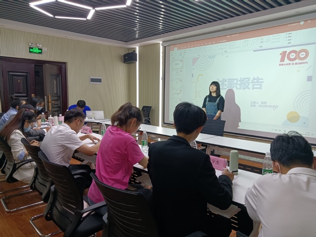 答辩环节,各候选人按抽签顺序进行竞聘答辩,答辩结束后由评委们进行评分。答辩过程中,各位候选人依次上台进行6分钟述职报告。每位竞选人使用PPT从自我介绍、从事期间工作情况、竞职优势及未来展望向评委们进行阐述。大家的演讲方式各有特色,但共同点是其中所包涵的自身成长和对帮助自己的老师与学长学姐的感谢之情。评委们根据竞选人现场展现出的优势与问题进行总结,并针对性地各部门候选人各自职能提出的针对性问题,如面对各种问题时的解决办法、对自身工作如何认识等,还涵盖了一些开放性问题。最后评委们秉持公平公正原则,根据竞选人现场仪表仪态,岗位认知、表达能力、分析解决问题能力及应变能力等综合能力的表现进行各项评分。会议最后,评委们对下学年团学组织新成员表示充满信心和期待。