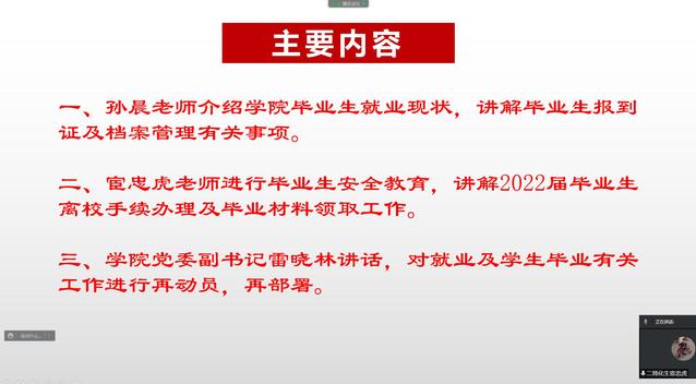 会议开始,孙晨向大家介绍了化生学院22届毕业生目前就业情况,学院截止5月30日,总的就业率达到54%。尚有大量同学没有完成就业。对于涉及到毕业生毕业材料上报和档案问题,孙老师进行了详细讲解。对就业信息上报、网签等进行了指导,毕业后学籍档案去向和选择问题进行了系统分析,要求大家尽快完成信息核对,确保档案准确投递。随后,宦忠虎进行了毕业生安全教育,结合疫情防控工作要求,从“三防”防溺水、防火灾事故和防交通安全到求职安全、工作中要注意的安全细节,都进行了详细的讲解。要求全体毕业生遵守所在地方的疫情防控要求和纪律,按时参加核酸检测,出行做好安全防护措施,工作中注意安全细节,确保个人安全。在毕业求职中注意分辨,谨防上当受骗,毕业生离校后租住房屋最好结伴居住,提高安全意识,遇到困难及时联系辅导员老师。对于2022届毕业生离校手续办理流程和注意事项进行了仔细解读。会议的最后,雷书记对就业工作进行再动员,号召大家积极求职,顺利完成就业,发挥专长,积极投身社会实践。对毕业生安全问题方面进行了强调并祝愿所有毕业生们工作顺意。