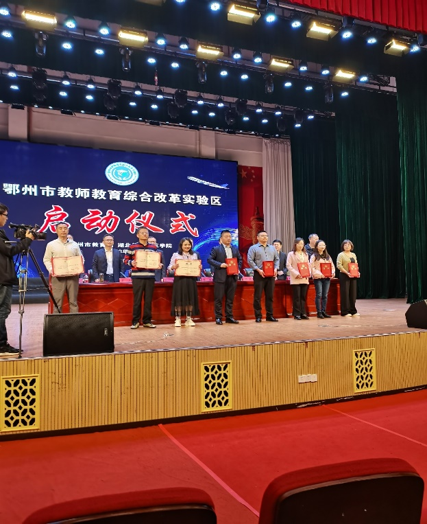 湖北第二师范学院校长郑军、副校长夏力,鄂州市副市长邱实,湖北省教育厅教师资格认定中心副主任程少波参加启动仪式,鄂州市政府副秘书长蔡宇主持启动仪式。湖北第二师范学院与鄂州市共建“鄂州市教师教育综合改革实验区”,不仅为进一步深化教师教育综合改革,全面加强鄂州市中小学教师队伍建设,还为我校优秀毕业生实习就业提供方向。启动仪式上,与会领导为湖北第二师范学院30名实验区发展导师颁发了聘书。我院陈功轩副院长、孙建明副教授被聘为鄂州市教师教育综合改革实验区发展导师,聘期肆年。这为我院加强校地联合,强化师范生技能训练以及师范生的实习就业,拓展了崭新的发展空间。
