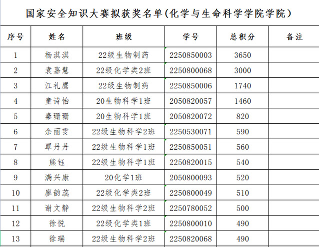 根据上级部门有关通知,为大力推进国家安全教育进校园,不断引导学生增强国家安全意识和素养,提升维护国家安全能力,现结合学院实际情况,已与3月10至4月15日以“学习领悟二十大精神,国家安全你我共同守护”为主题开展国家安全知识大赛。本次活动中全院同学积极参与热情较高,最后根据全院学生总积分情况,现将我院2023年全省国家安全知识大赛拟获奖名单公示如下: