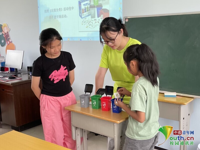图为志愿者在带领小朋友们进行垃圾分类趣味游戏。中国青年网通讯员 刘雨婷 摄