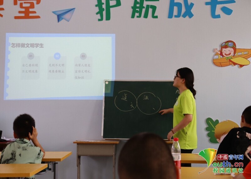 图为志愿者在向小朋友们讲解“怎样做文明学生”课程。中国青年网通讯员 刘雨婷 摄