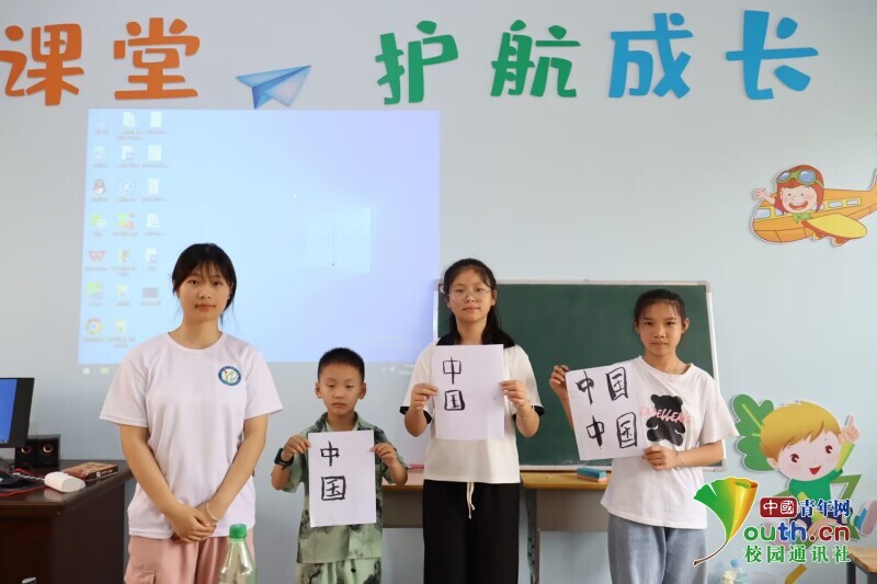 图为志愿者在指导小朋友写“中国”两字 。中国青年网通讯员 刘雨婷 摄