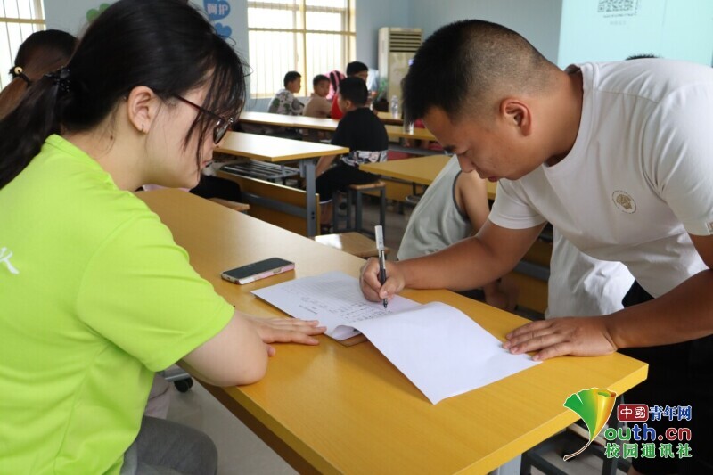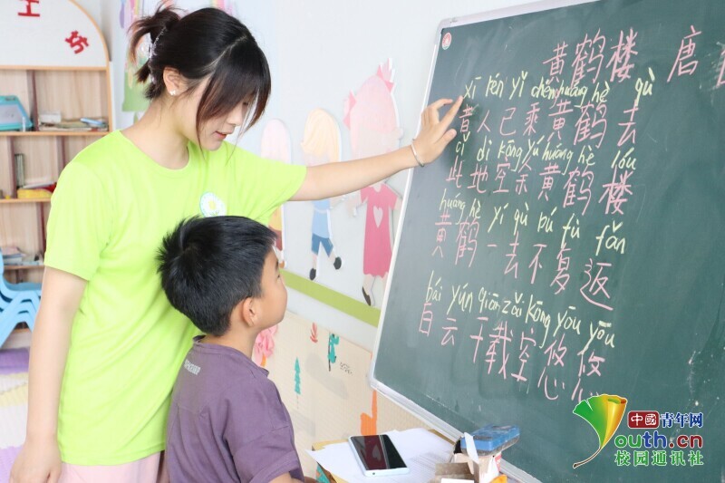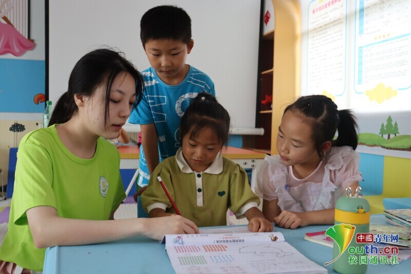 图为学科辅导课时,志愿者根据小朋友的知识薄弱点给予帮助。中国青年网通讯员 蒋怡菲 供图