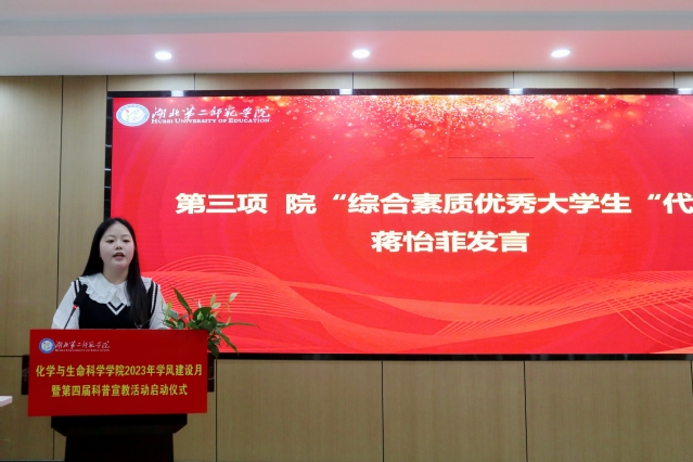 与会领导为化生学院“先进集体”、“综合素质优秀大学生”、“优秀学生干部”颁发荣誉证书。优秀学生代表蒋怡菲在发言中号召全体化生学子结合自身专业知识勇于创新,锐意进取,共同营造良好的校园科学文化氛围,以实际行动树立优良学风。