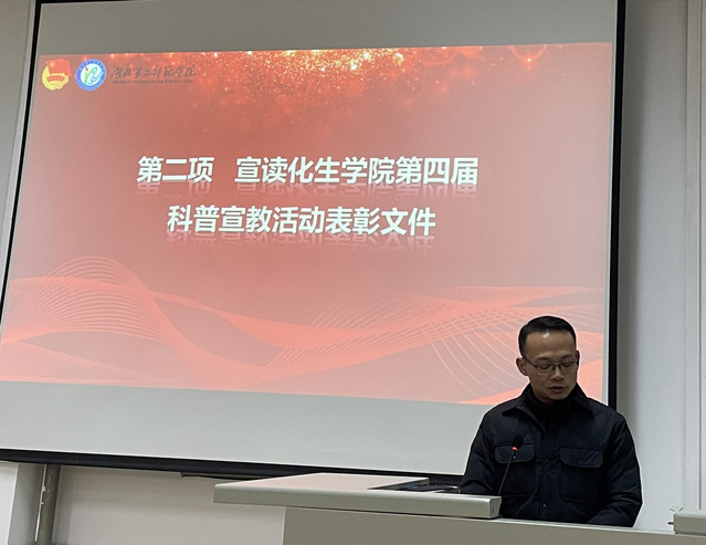 本网讯(通讯员 袁满 张灏)化学与生命科学学院通过开展丰富多彩、形式多样的科普宣教活动不断探索推动学风建设与人才培养相融相促,旨在弘扬科学精神,普及科学知识,守正拓实,久久为功,营造我院良好学风氛围。为更好地总结工作,表彰优秀,12月21日,我院于报告厅4召开第四届科普宣教活动暨学风建设月总结表彰大会。参加此次大会的有我院党委副书记雷晓林,副院长张宇,学院全体辅导员以及2023年学风建设月活动优秀工作者及先进集体学生代表。