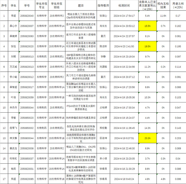 根据《本科毕业论文(设计)工作管理规定》(院教[2018]42号)文件要求:按学院应届本科毕业论文总数的15%-20%评出“学院优秀毕业论文(设计)”,其论文原创性检测相似比与校内互检结果之和≤25%且同时原创性检测相似比≤20%。按不超过10%的比例向学校推荐“校优秀毕业论文(设计)”。参加校级和省级优秀论文评选的本科生毕业论文(设计),其论文原创性检测相似比与校内互检结果之和≤20%且同时原创性检测相似比≤15%。现将各答辩组推荐优秀论文进行原创性资格审查结果公布如下: