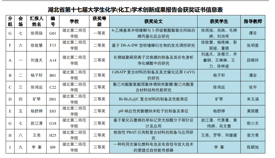 (通讯员:欧小文)2024年5月31日,应用化学专业负责人欧小文老师带领化学与生命科学学院10名学生前往汉江师范学院参加“湖北省第十七届大学生化学(化工)学术创新成果报告会”,张宇副院长受邀担任此次报告会评委老师。此次比赛共有来自武汉大学,华中科技大学和华中师范大学等30所高校的258名同学参加。经过一天激烈的角逐后,我院学生最终获得1项一等奖,2项二等奖,8项三等奖的成绩。具体获奖信息如下表: