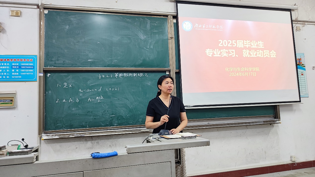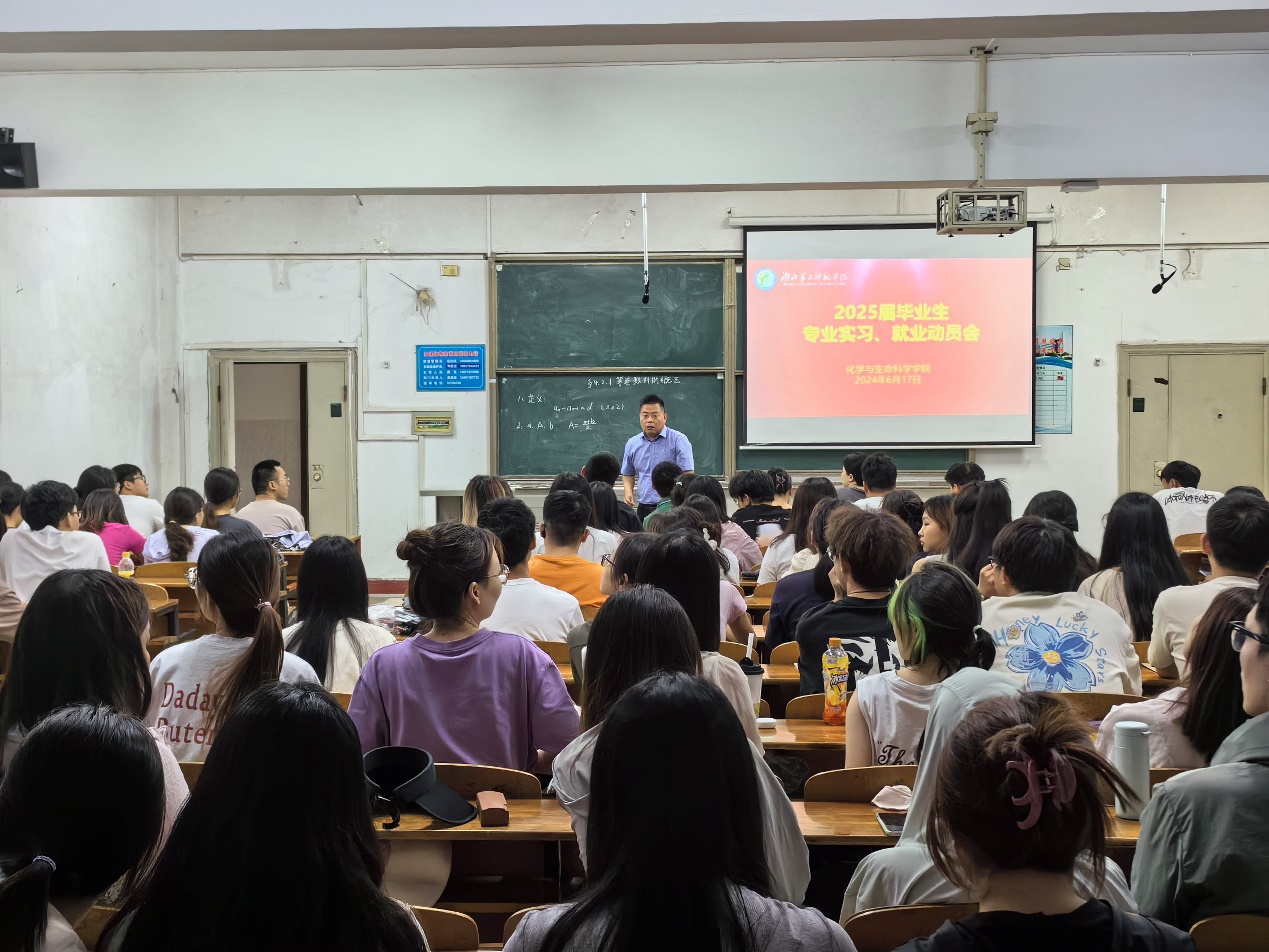 本网讯(通讯员 张灏)为扎实做好2025届毕业生实习就业工作,进一步提升学生职业规划意识,更好完成实习就业工作,6月17、18日,化学与生命科学学院召开2025届本科生专业实习动员会。教学副院长陈功轩,院党委副书记雷晓林,专业老师王亮节、欧小文、熊校勤、钟静,2021级辅导员张灏及全体学生参加会议。