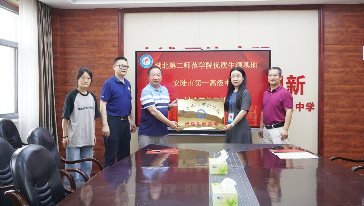 在安陆市第一高级中学,我院一行与校长游盼、办公室主任刘宗敏等深入交流,曾国平院长介绍了学校和学院招生情况,欢迎学生报考化学、生物等相关专业,为学校“优秀生源基地”授牌。与会人员看望慰问了生物科学专业应届毕业生秦珊珊,了解其目前的工作生活情况,勉励其保持初心,潜心教学,在教育事业上做出突出的成绩,秦珊珊表示会谨记母校教诲,投身基层教育,发挥人民教师的光与热。
