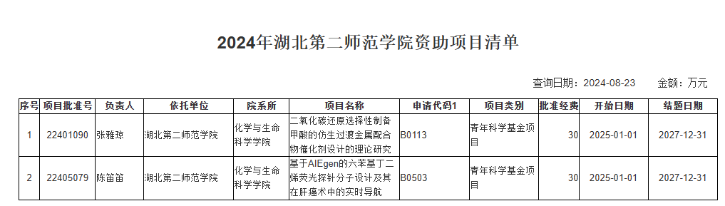 8月23日,国家自然科学基金委员会公布了2024年度国家自然科学基金项目评审结果。我院国家自然科学基金项目共申报15项,获批2项,均为青年科学基金项目,立项率13.33%。两个获批项目分别是张雅琼博士主持的《二氧化碳还原选择性制备甲酸的仿生过渡金属配合物催化剂设计的理论研究》和陈笛笛博士主持的《基于AIEgen的六苯基丁二烯荧光探针分子设计及其在肝癌术中的实时导航》。
