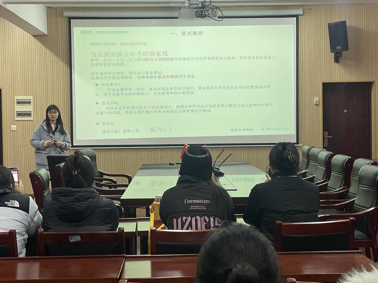 本网讯(通讯员 张灏)3月5日,化生学院于321会议室开展考研复试专题辅导,邀请新东方考研讲师对考研过线学生作培训,学院副院长张宇参加。