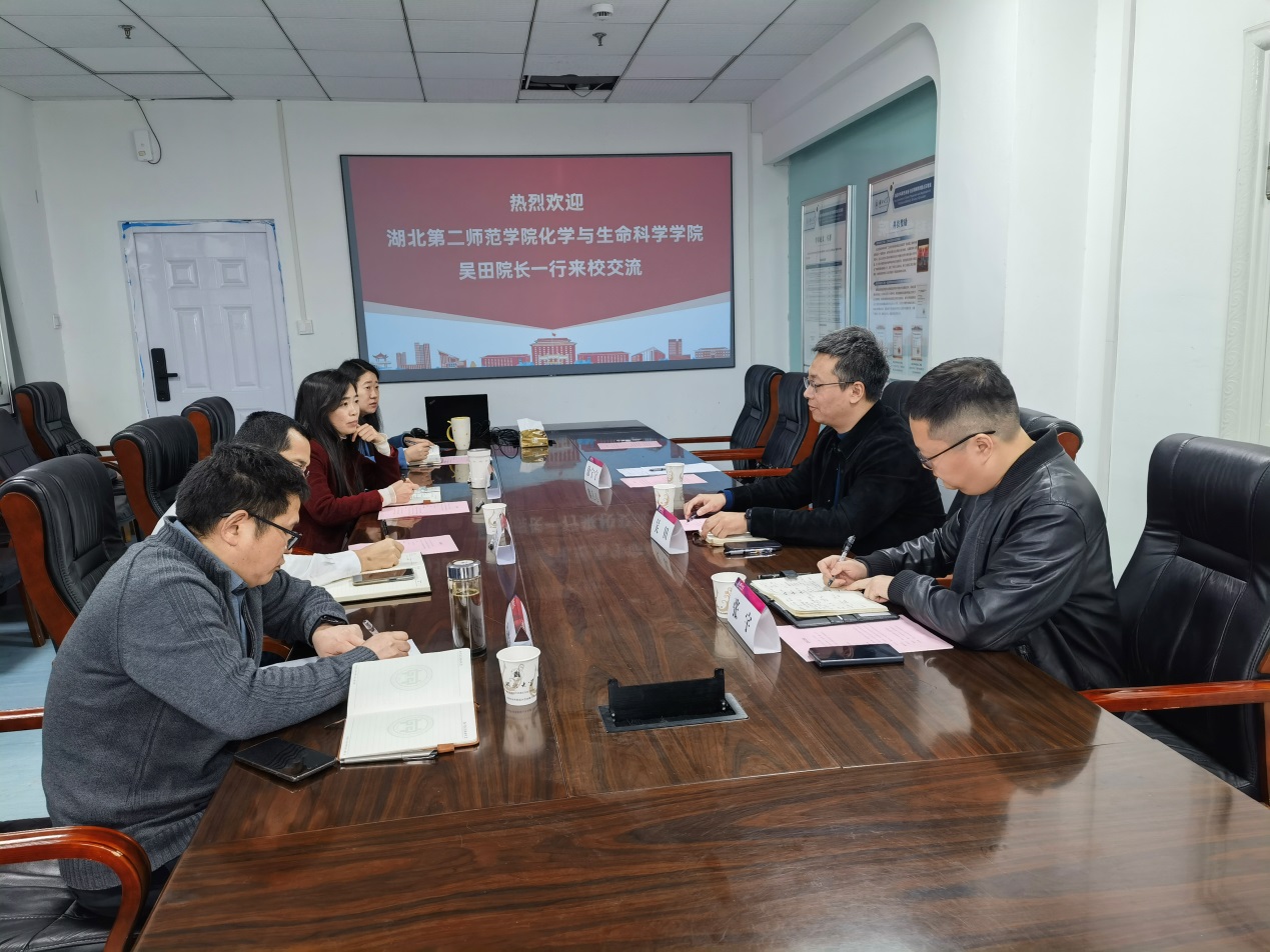 吴田院长简要介绍了湖北第二师范学院化学与生命科学学院的基本情况,他表示,湖北大学与湖北第二师范学院同宗同源,办学历史悠久、发展思路清晰,在人才培养、教学科研等方面都取得了令人瞩目的成绩。希望双方以后能够加强交流,保持密切联系,在学科发展、学生联合培养、实验室建设、硕士点申报方面能够给予指导。张宇副院长主要从研究生校外导师的聘任、联合培养研究生、实验室建设以及申硕材料的指导等方面与学院领导进行了沟通。双方交流愉快,取得了满意的效果。