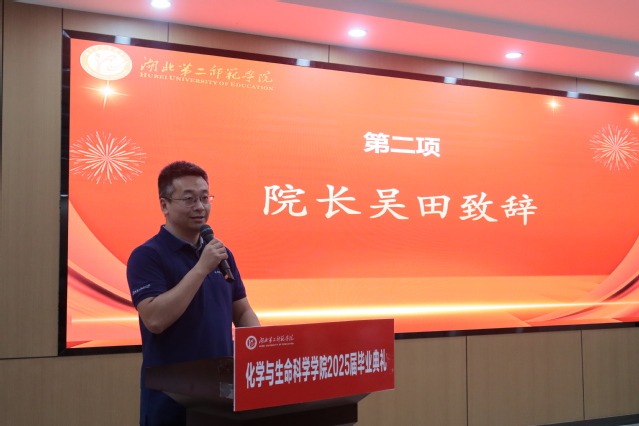典礼在庄严的国歌声中拉开帷幕。院长吴田教授为毕业生送上殷切寄语,希望同学们“擦亮爱国底色、牢记育人使命、勇立创新潮头”,在民族复兴与教育强国的征程中砥砺前行。他勉励毕业生争做时代“大我”,并深情表示学院永远是大家的坚实后盾。