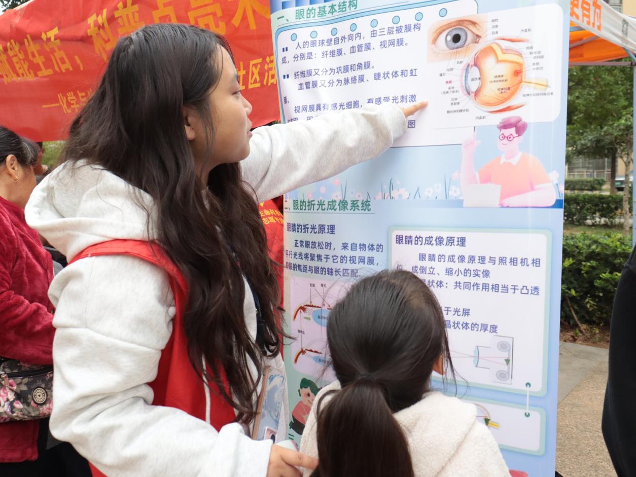 志愿者们借助模型展示眼睛的结构,关注居民的用眼健康,详细讲解长时间看手机、电脑对眼睛造成的伤害,并传授简单易行的护眼技巧。针对不同年龄段的孩童群体,志愿者分别提出了相应的护眼建议。他们以实际行动践行“行走的大思政课”理念,用心守护小朋友们的“心灵窗户”。