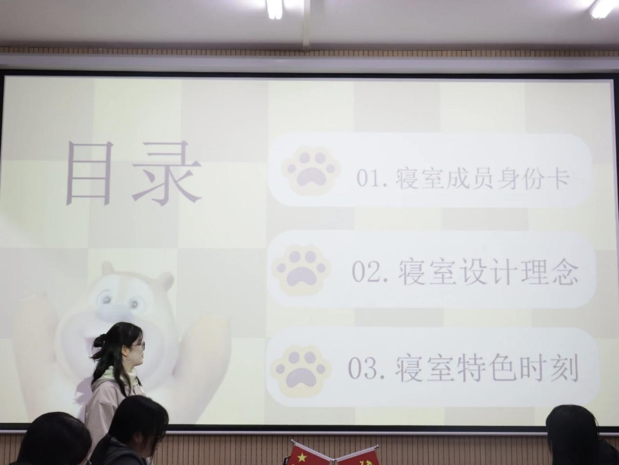 分享环节结束后,各参赛寝室代表围绕“我的社区我的家”主题,以生动的语言、饱满的热情展开了寝室风采介绍。现场展示的创意既有“简约环保”的实用理念,践行绿色社区的生活方式;也有“青春主题”的个性表达,展现社区学子蓬勃朝气;更不乏深度融入化生专业特色的巧思设计,将学科魅力与社区文化完美融合,充分体现了“一站式”社区作为学生成长共同体的丰富内涵。
