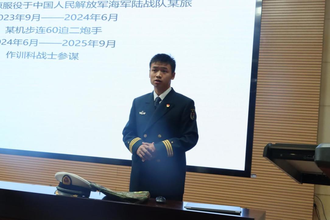宣讲会上,周少奇结合在海军陆战队的两年服役经历,系统解读了国家征兵政策,并以详实数据介绍了部队的待遇保障体系。针对不同兵种特点,他进行了细致分析,为同学们梳理了入伍后的多元选择。他还结合自身体会,鼓励经济条件有限的学生关注新疆、西藏等地区的入伍机会。