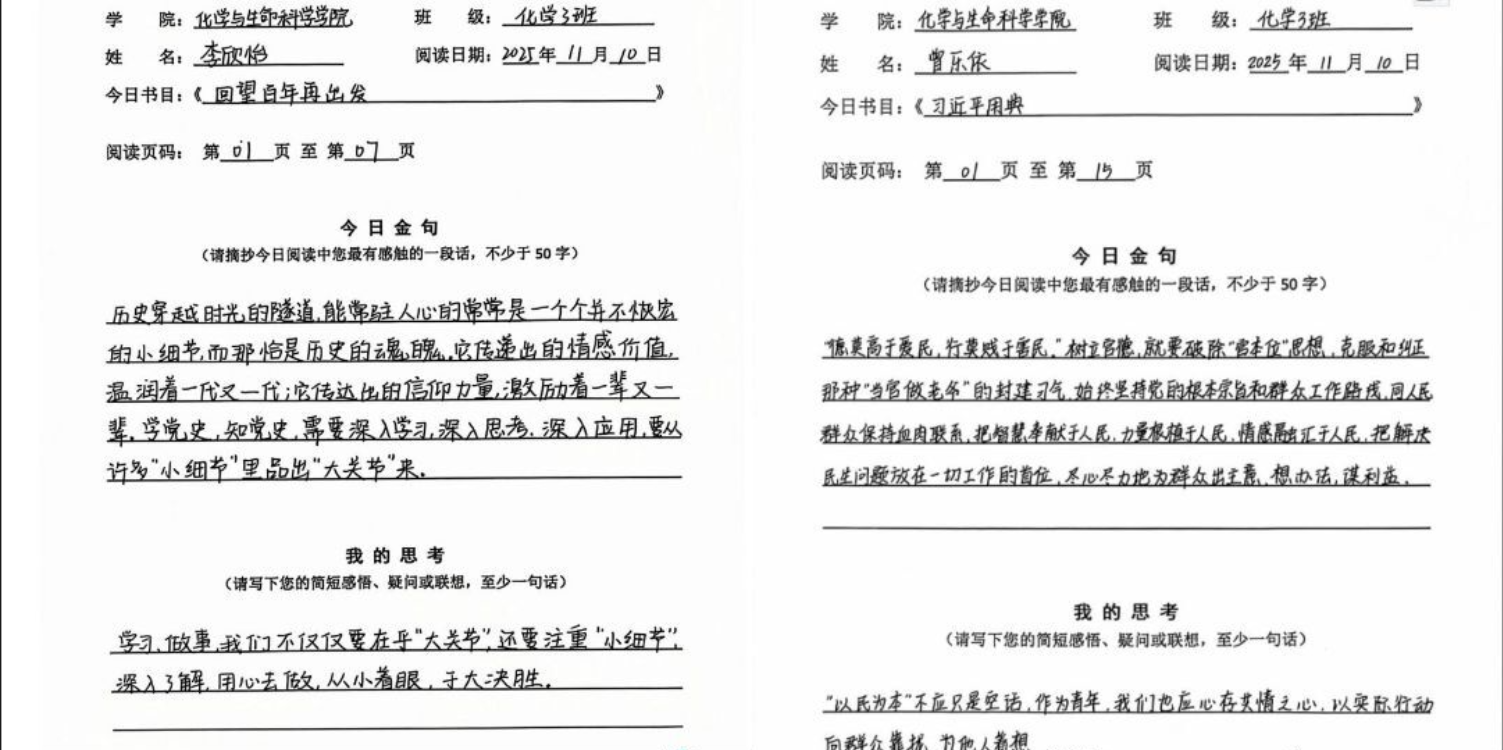 为保障活动实效,学院成立读书活动指导小组,定期巡查活动开展情况。活动结束后,各班还将精选优秀摘抄卡装订成《班级阅读札记》,制作包含精彩瞬间、师生采访、成果展示的主题视频,参与院级与校级评优。优秀班级不仅将获得荣誉证书,其经验做法还将被广泛推广,发挥榜样引领作用。
