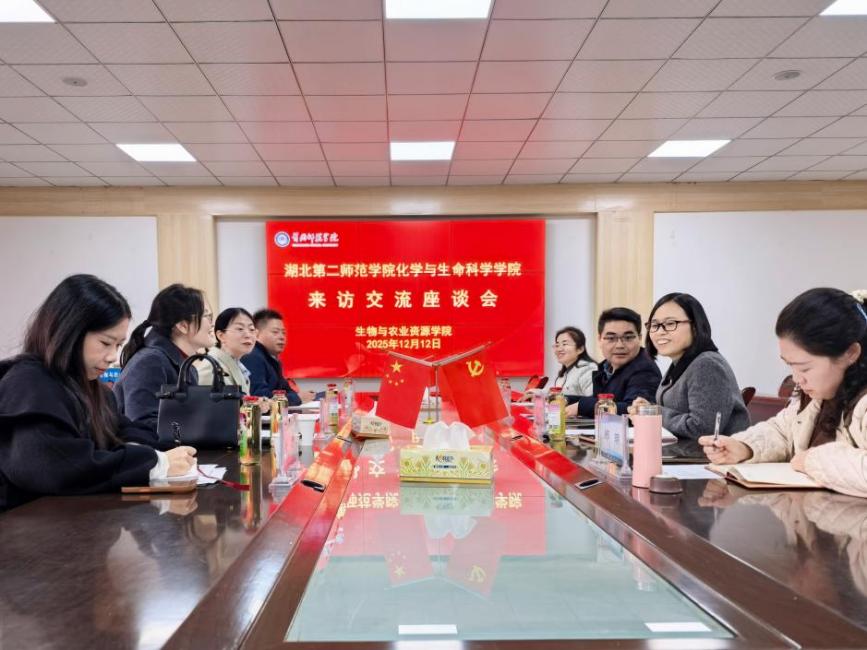 2025年12月12日,院长邓樱花带领副院长陈功轩、院长助理齐小琼及青年教师徐航赴黄冈师范学院开展学习交流活动。黄冈师范学院生物与农业资源学院党委书记闵艳林、院长肖云丽等领导接待并举行了交流座谈会。
